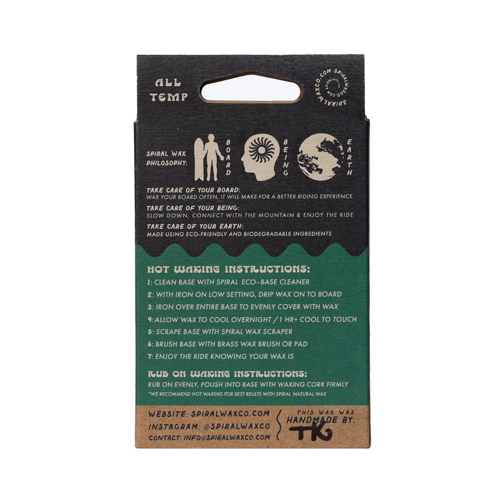 The Power of Nature! Spiral's original Natural Snowboard wax is like no other: Natural ingredients and handmade by snowboarders in Bend, Oregon. It stands to be the cornerstone of your board-care ritual without sacrificing performance. Treat it as you would any wax, but rest assured, it's crafted from plant-based ingredients that won't harm the Earth: a stark contrast to the Petroleum-Based / Fluorocarbon composition found in most other snowboard waxes. PFAS-Free, Biodegradable & Non-Toxic. Choose Spiral. Elevate Your Ride, Protect the Earth.
